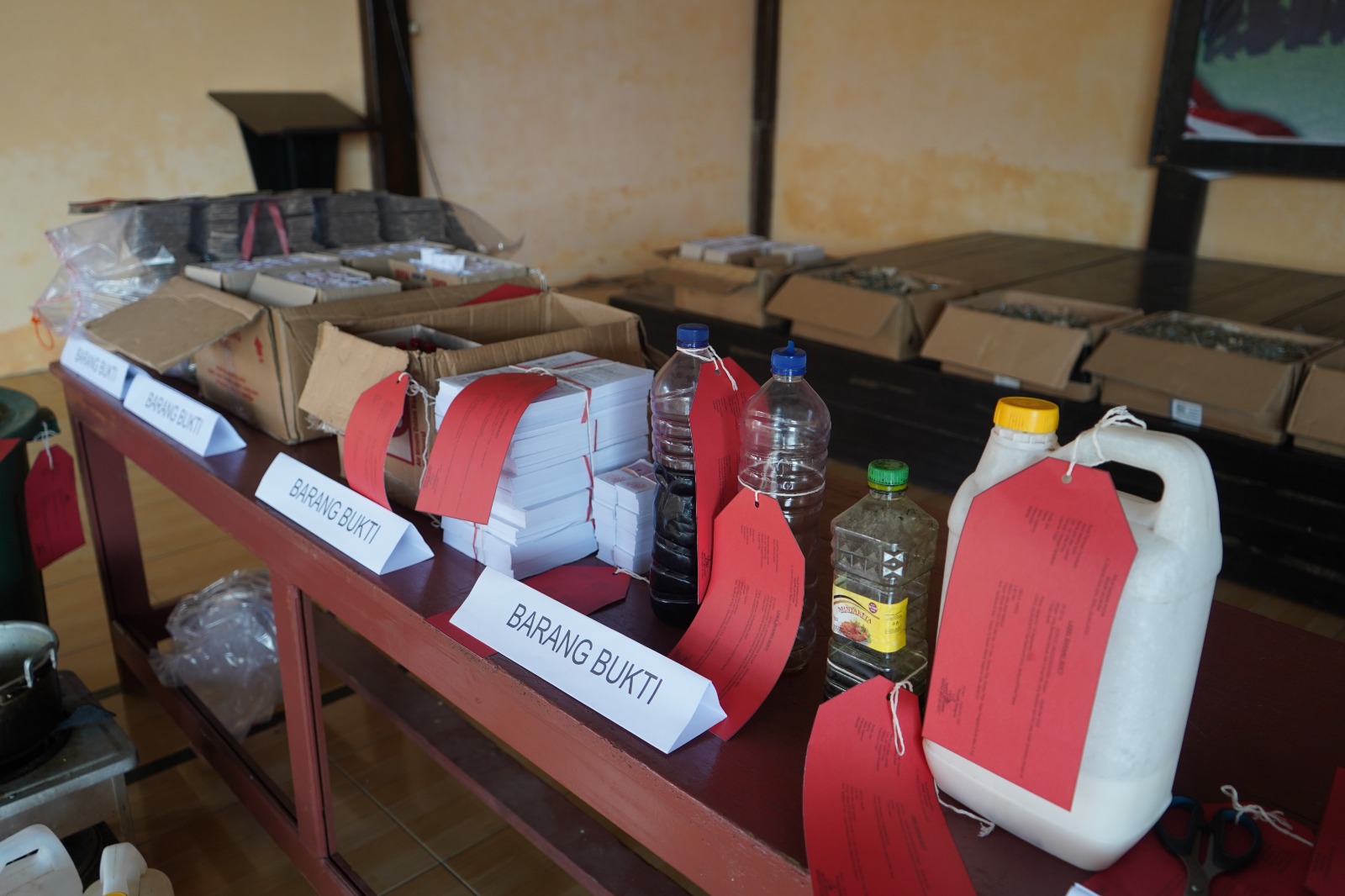 Di antaranya, 900 botol kaca kosong ukuran DD, 246 botol berisi minyak Tawon ukuran DD, 94 botol ukuran CC, 144 botol ukuran EE, 337 botol ukuran FF, serta ribuan perlengkapan produksi lainnya. Barang bukti juga ditemukan di toko wilayah sentani dengan total 192 botol minyak gosok siap edar.