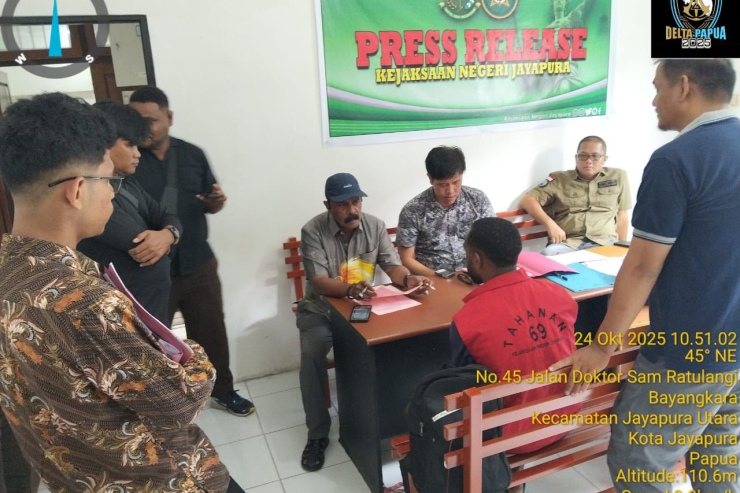Jayapura, semuwaberita.com – Personel Operasi Damai Cartenz-2025 melaksanakan kegiatan penyerahan tersangka dan barang bukti (Tahap II) terhadap satu orang tersangka atas nama Yopi Balingga di Kejaksaan Negeri Jayapura, Jumat (24/10/2025) pagi.