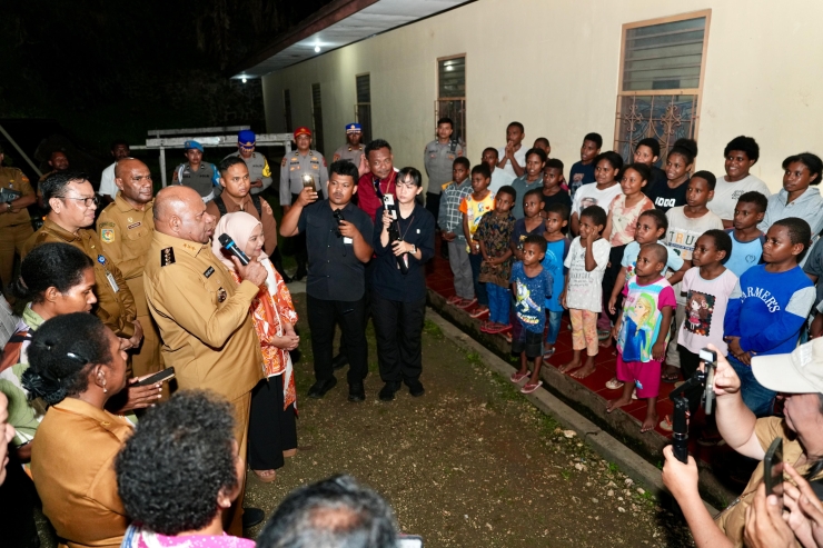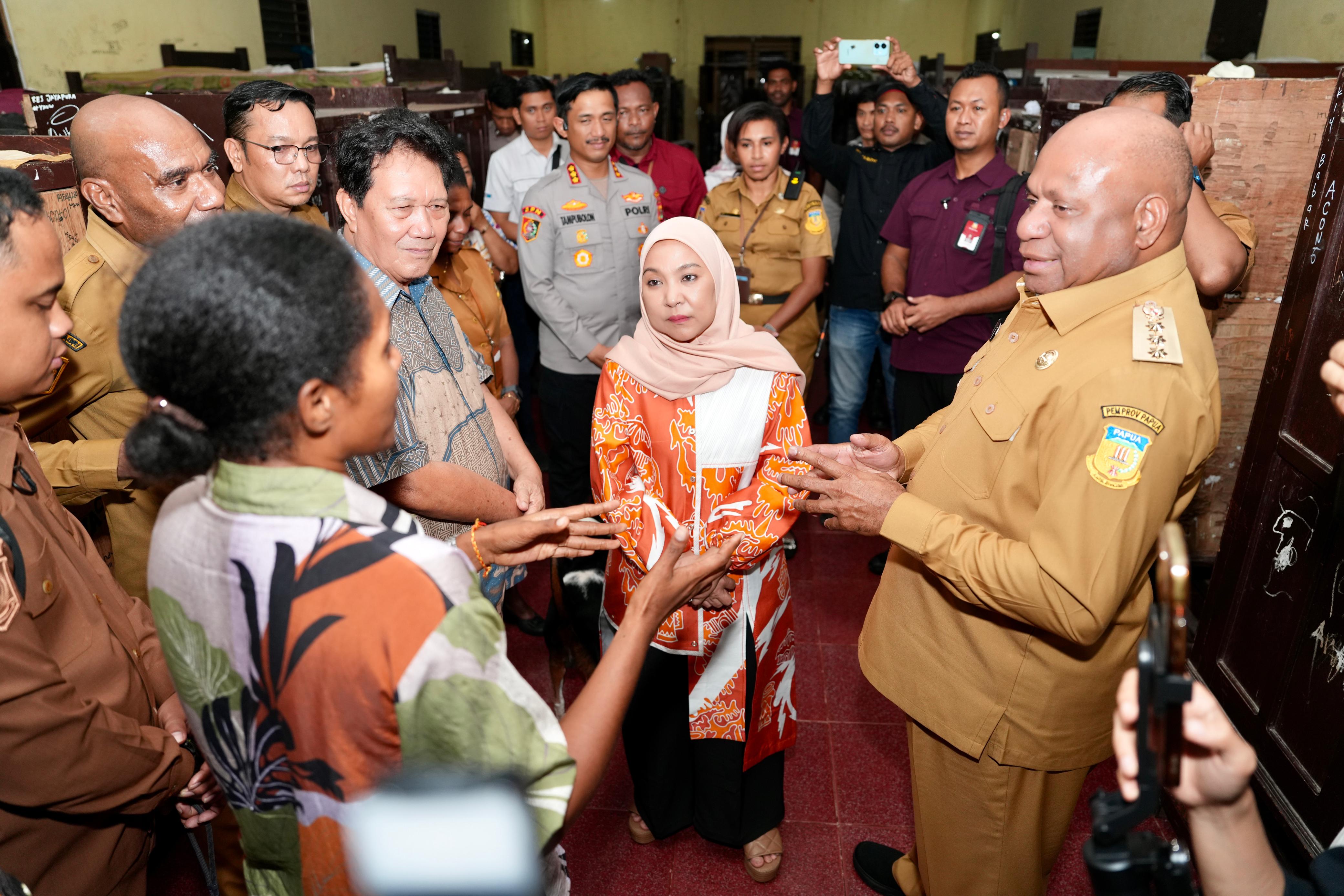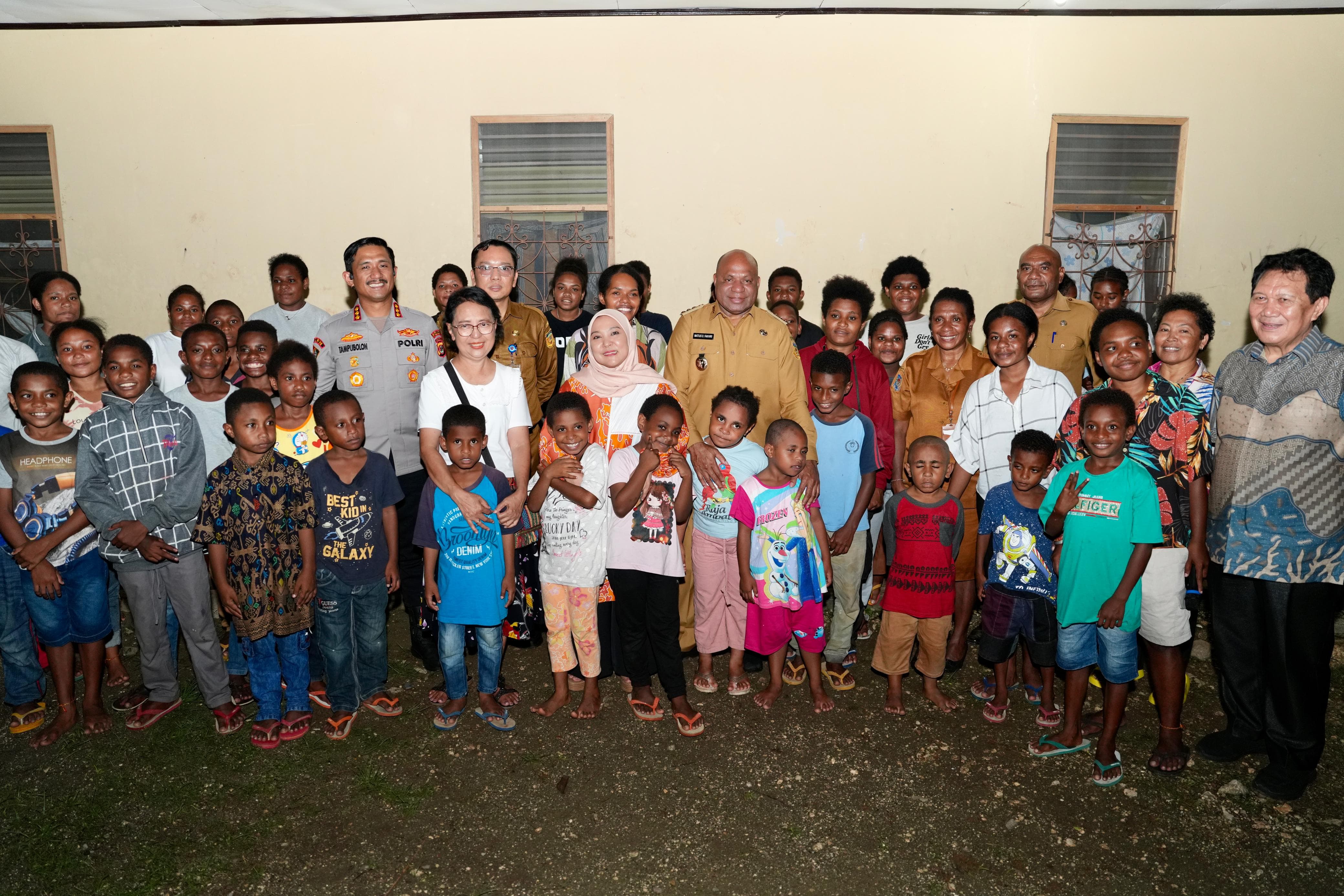 Jayapura, semuwaberita.com - Gubernur Papua, Matius Fakhiri bersama Ny. Eva Fakhiri mengunjungi anak-anak korban kebakaran Panti Asuhan Pembawa Terang (Peter) Holtekamp, yang kini mengungsi sementara di Sekolah Polisi Negara (SPN) Polda Papua, Kota Jayapura, Senin (27/10/2025) malam.