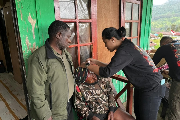 Foto : Dokter personil Satgas Ops Damai Cartenz sedang melakukan pemeriksaan kesehatan seorang warga di Sinak, Puncak/foto:Humas Damai Cartenz