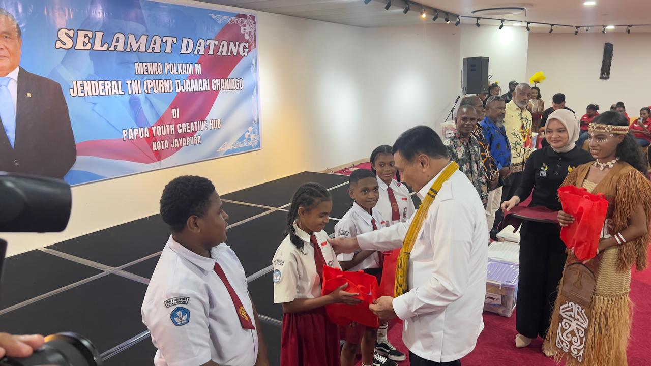 Disana, Menko Polkam berkesempatan memberikan bantuan tali asih kepada anak anak sekolah dan juga para Tokoh Adat.