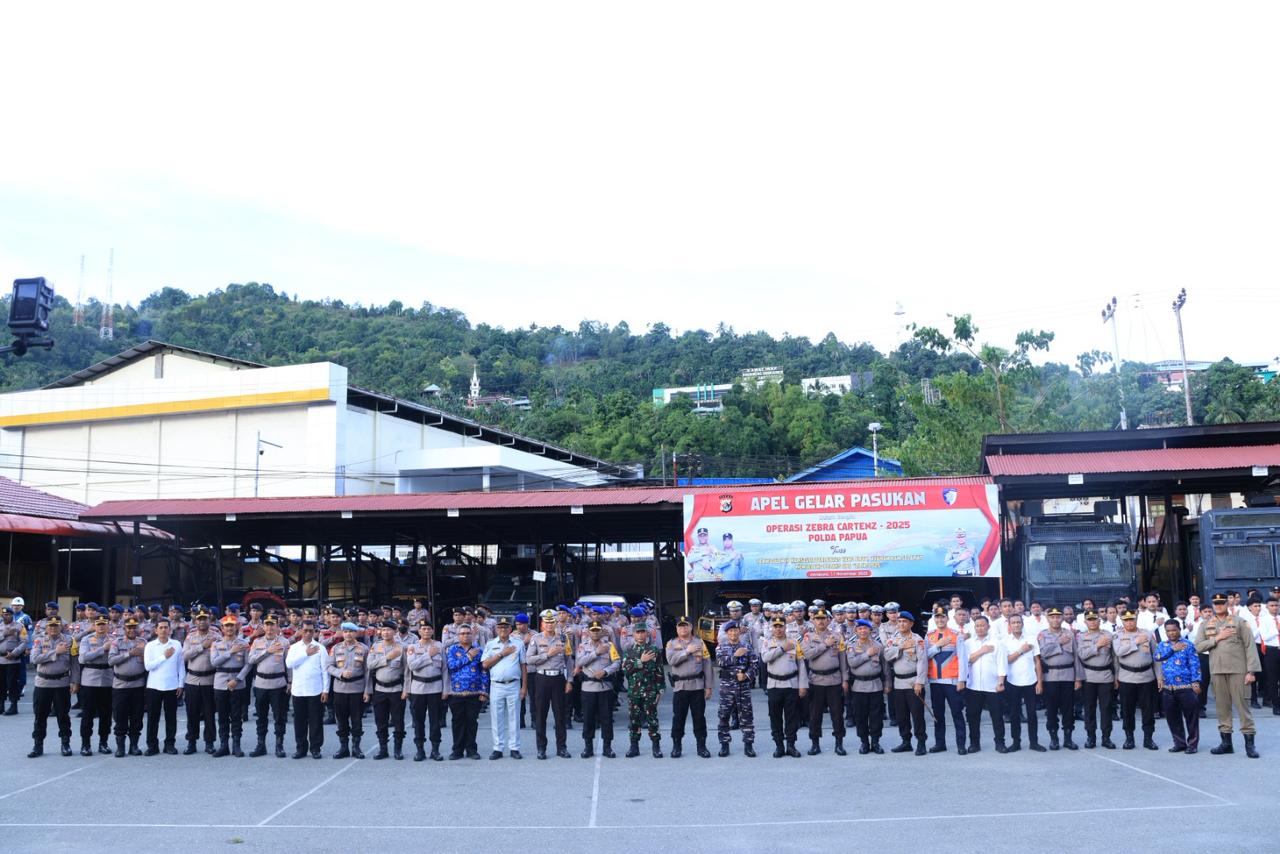 Apel Gelar Pasukan Operasi Zebra Cartenz-2025 berlangsung di Mapolda Papua dan dipimpin Kapolda Papua, Irjen Pol Patrige Renwarin. Apel dihadiri para Pejabat Utama Polda Papua, perwakilan TNI, Jasa Raharja dan dinas/lembaga, serta personil Polda Papua.